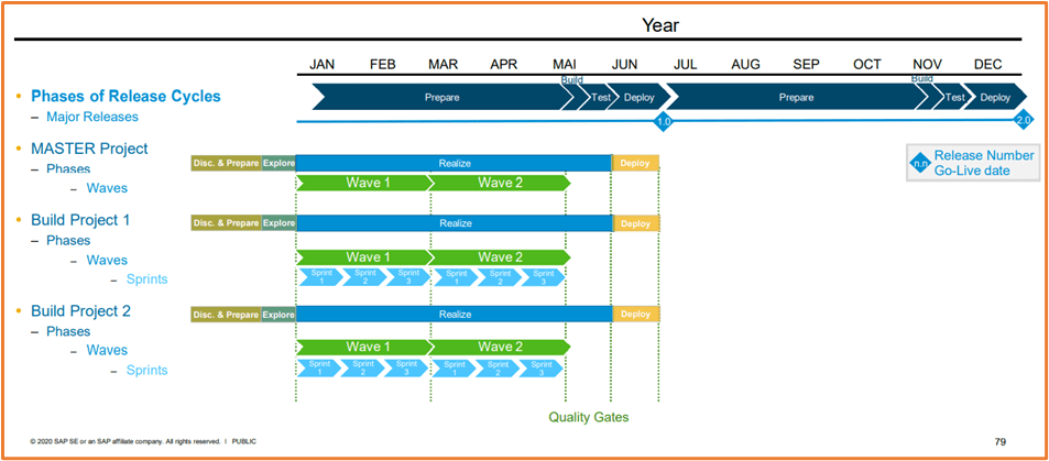 Projekte werden zunächst z.B. in MVPs/Releases bzw. Piloten/Rollouts untergliedert, dies sind Projektumfänge die gemeinsam produktiv gesetzt werden können. Die nächste Untergliederungsebene sind eine oder mehrere Wellen (Waves), welche wiederum mehrere Sprints umfassen. Sprints umfassen Work Packages, welche wiederum in Work Items untergliedert werden. Deren Qualitätssicherung (Quality Gates) erfolgt z.B. auf diesen drei Ebenen: Einzeltests (Work Items), Funktionstests (Work Packages) und die Abnahme erfolgt schließlich im UAT (Wellen), falls keine Nachbesserungsbedarf identifiziert wurde. Ergänzt wird der UAT ggf. um Regressions-, Integrations-, Rollen- und Nachtests. Wurden alle Quality Gates der Waves durchlaufen, kann die Produktivsetzung eingeleitet werden (Handover to Release). Während des Go-lives (Cutover) ist ein Smoke-Test empfehlenswert, bei dem die Datenmigration, kritische Funktionalitäten, Schnittstellen, Peripherie usw. in einem kurzen Test (z.B. zwei Stunden) auf Plausibilität und Funktion geprüft werden.