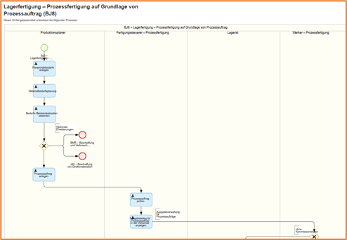 Die Diagrammart bezeichnet man auch als Swimlane-Diagramme. Mittlerweile hat sie sich als Standard-Modellierungsmethode im Prozessmanagement etabliert. Sie stellt eine Kombination aus Zuständigkeitsdiagrammen und klassischen Flussdiagrammen dar. In Bahnen werden dabei die Zuständigkeiten (Personen/Abteilungen und Systeme) und Prozessabfolgen dargestellt. So lassen sich die Prozessabfolge (gesamte „Beckenlänge“), Vorgänger-Nachfolgerbeziehung (Pfeile) der Prozesse/Aktivitäten (Kasten) sowie interne und externe Zuständigkeiten übersichtlich darstellen. Gehen alternative Aktivitäten/Prozesse aus einer Aktivität hervor, so können diese wahlweise über eine UND- bzw. ODER-Verknüpfung (Raute) dargestellt werden. Bei Wikipedia finden Sie eine detaillierte Darstellung mit einem guten BPMN-Beispiel (Business Process Model and Notation). Ziel ist es letztlich den Detaillierungsgrad derart zu wählen, dass man einen unkomplizierten Überblick über Zuständigkeiten, Prozessschritte, Entscheidungen, zeitliche Abfolgen, Informationsflüsse und Schnittstellen zu anderen Prozessen/Systemen bekommt.