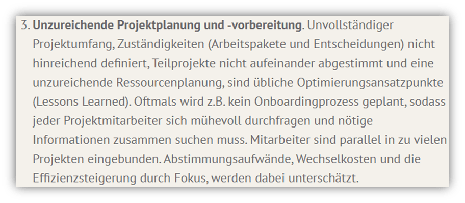 Unzureichende Projektplanung und -vorbereitung. Unvollständiger Projektumfang, Zuständigkeiten (Arbeitspakete und Entscheidungen) nicht hinreichend definiert, Teilprojekte nicht aufeinander abgestimmt und eine unzureichende Ressourcenplanung, sind übliche Optimierungsansatzpunkte (Lessons Learned). Oftmals wird z.B. kein Onboardingprozess geplant, sodass jeder Projektmitarbeiter sich mühevoll durchfragen und nötige Informationen zusammen suchen muss. Mitarbeiter sind parallel in zu vielen Projekten eingebunden. Abstimmungsaufwände, Wechselkosten und die Effizienzsteigerung durch Fokus, werden dabei unterschätzt.
