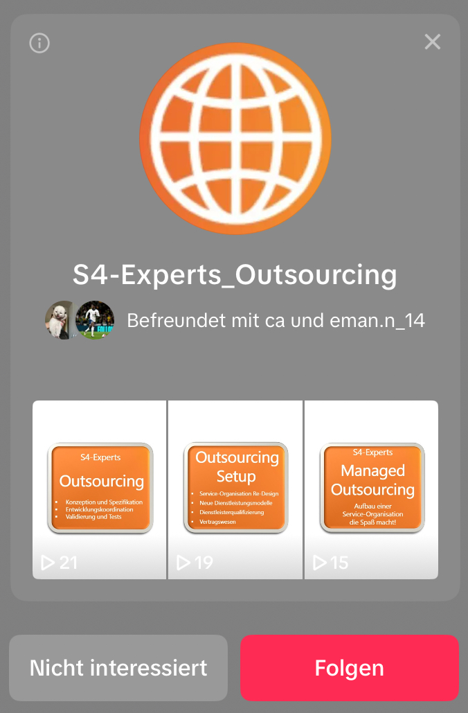 - SocialMedia4You: Eigene Accounts bei LinkedIn, Instagram, X (Twitter), Meta (Facebook), TikTok, YouTube und Threads, ergänzt um weitere Accounts des Partnerunternehmens S4-Experts, die Ihrer Markenbildung ebenso zuträglich sind. Die Accounts wurden vom Social Media Team auf Mittelstandsniveau aufgebaut, d.h. vergleichbar mit Ihrer Konkurrenz.